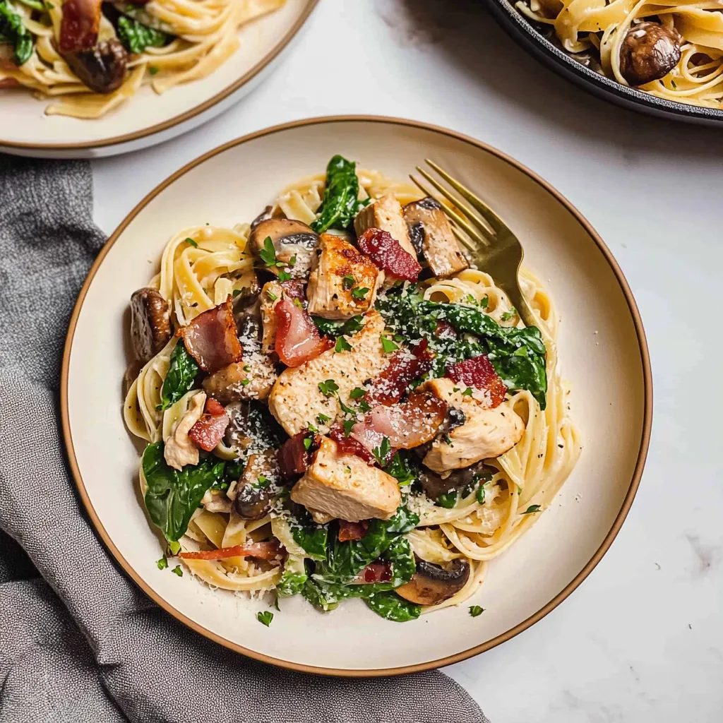 Hey there, friend! Today, I’m super excited to share one of my absolute favorite recipes: Chicken Bacon Mushroom Pasta with Spinach. This dish isn’t just any weeknight meal; it’s a comforting hug served on a plate. The first time I made it was during a chilly fall evening, and I remember the kitchen filled with the mouthwatering aroma of sizzling bacon, earthy mushrooms, and tender chicken. It felt like home. And as the pasta cooked, I found myself daydreaming about my grandma’s creamy dishes that always seemed to lift my spirits.