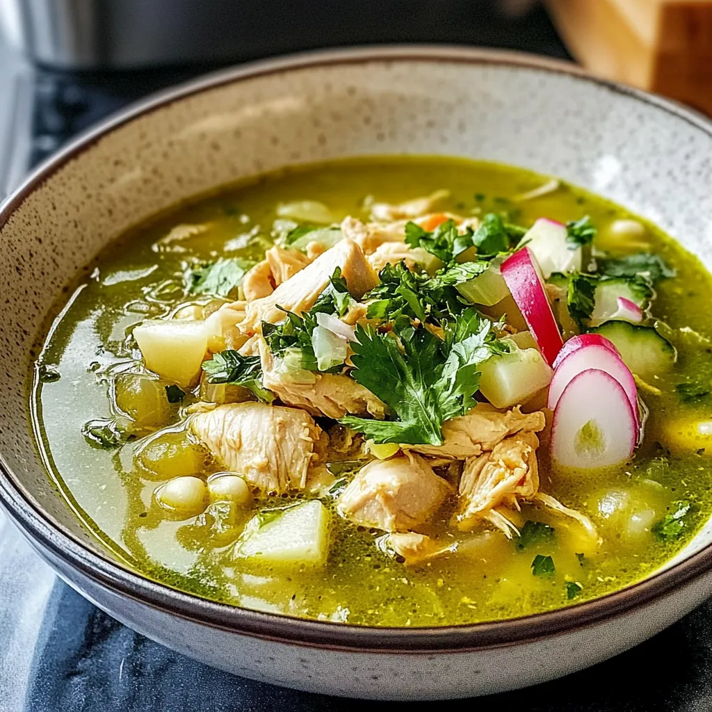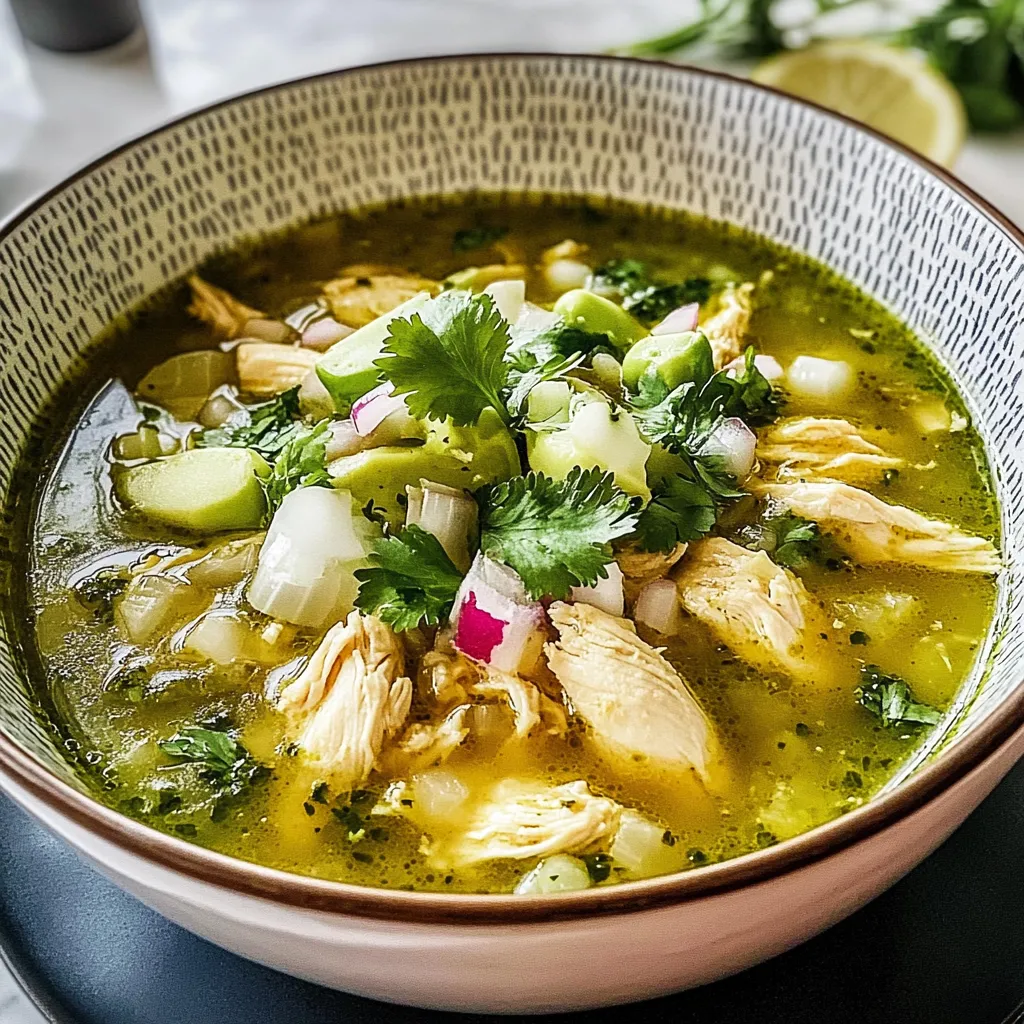 When it comes to serving your Chicken Pozole Verde Soup, keep it cozy! I love to serve it in hearty bowls, with a sprinkle of avocado, radishes, and additional cilantro on top. Pair it with warm corn tortillas or crusty bread for dipping. You can even have a little side salad with lime vinaigrette to freshen things up. And don’t forget a cup of coffee or a crisp white wine to really complete the experience!
