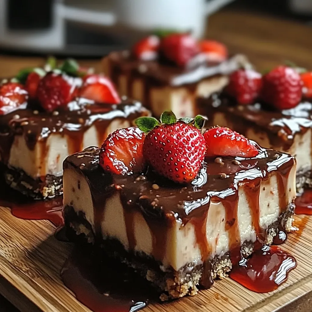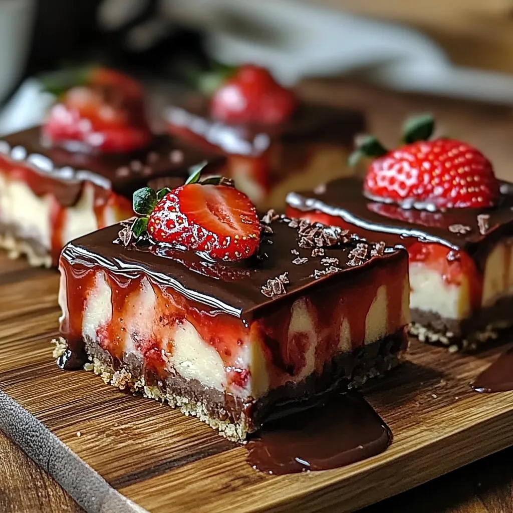 Not only do these bars look gorgeous, but they also deliver a symphony of flavors and textures. Creamy cheesecake meets rich chocolate, complemented by the freshness of strawberries. Trust me; they’re a hit at any picnic, party, or even just a cozy night in with your favorite Netflix series. So, let’s roll up our sleeves and make some magic happen in the kitchen!