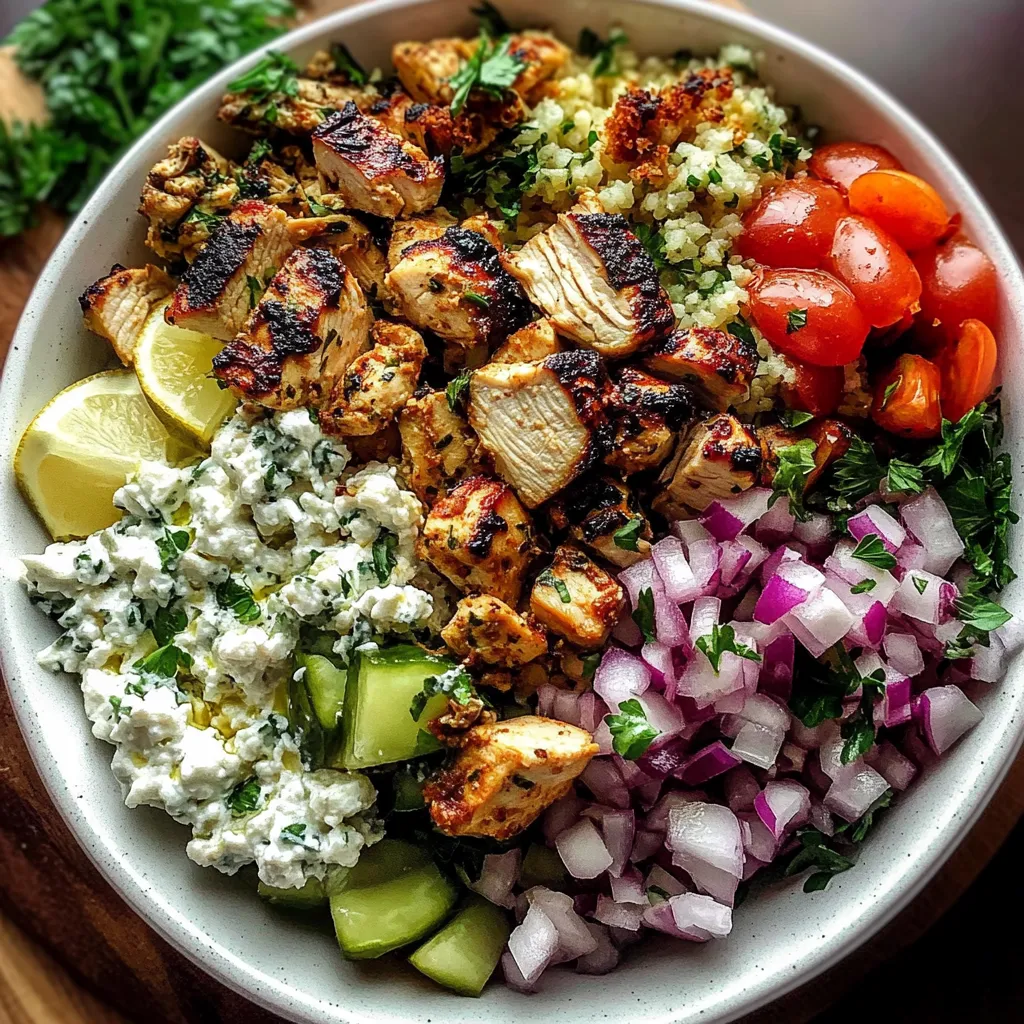 - Assemble Your Bowls: In each bowl, start with a layer of mixed greens, then top with the sliced chicken, cherry tomatoes, red onion, and olives. Don’t forget a generous dollop of tzatziki sauce topped with crumbled feta!
