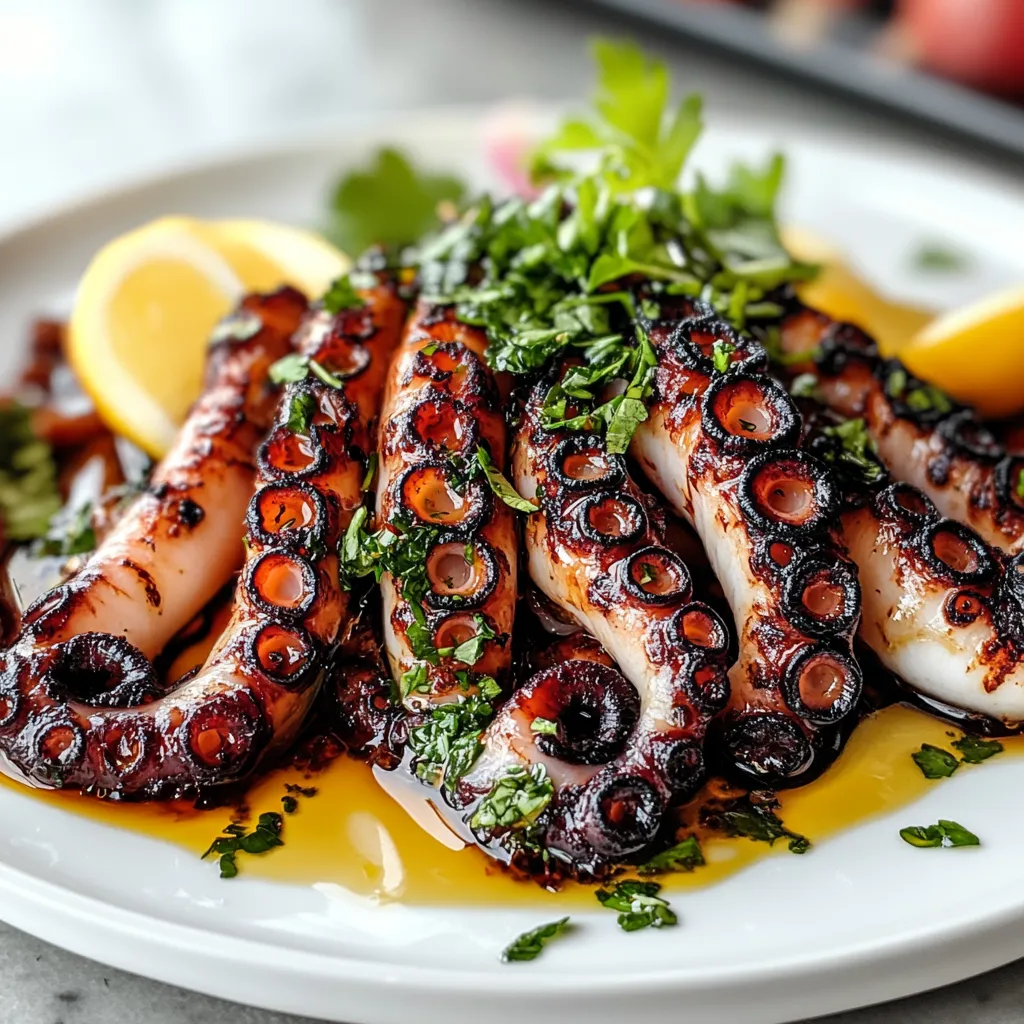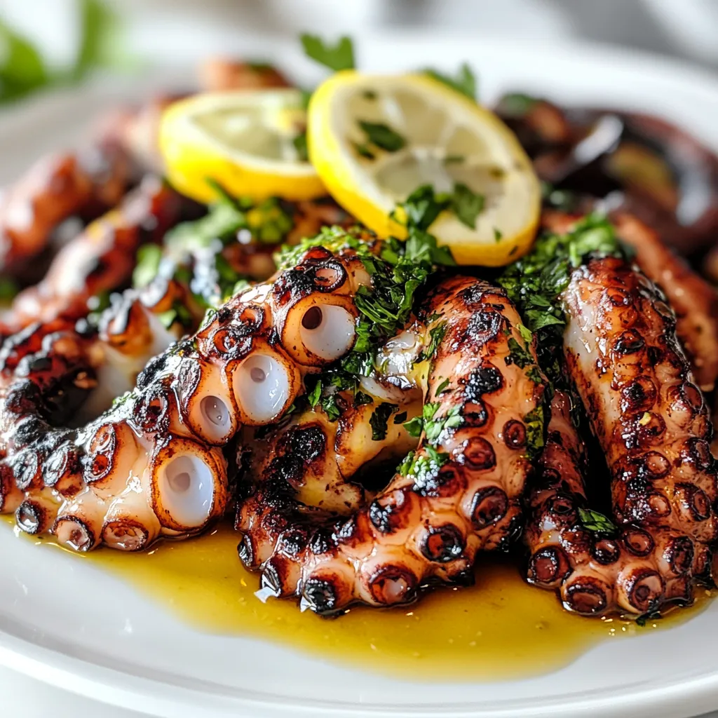 Now, let’s talk about how best to serve this beautiful dish! For me, a plate of grilled octopus isn’t just about the octopus; it’s about creating an experience. I love layering flavors with a side of lemon-dressed arugula salad or serving it alongside some crusty bread to soak up any delicious juices. Picture this: setting your dining table with a few candles, whipping up a vibrant summer salad, and pouring a chilled glass of white wine as the sun begins to dip. The octopus can be sliced and arranged artfully over a platter, adorned with lemon wedges and fresh herbs – it’s not just dinner; it’s a feast for the senses!