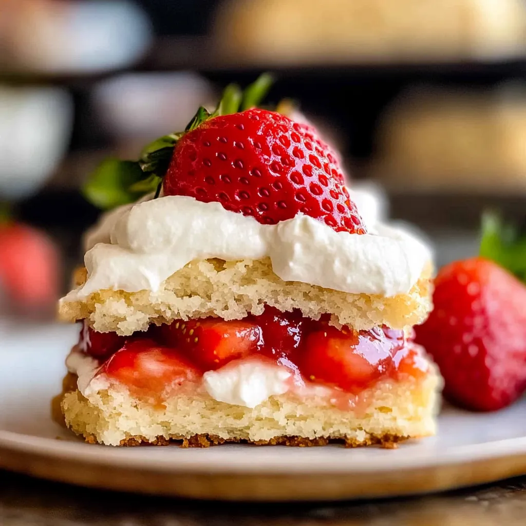 - Assemble your shortcake: Once the shortcakes are baked and slightly cooled, slice them in half. Layer the bottom half with a generous scoop of the macerated strawberries and their juices. Top with a big dollop of whipped cream and then place the top half back on.